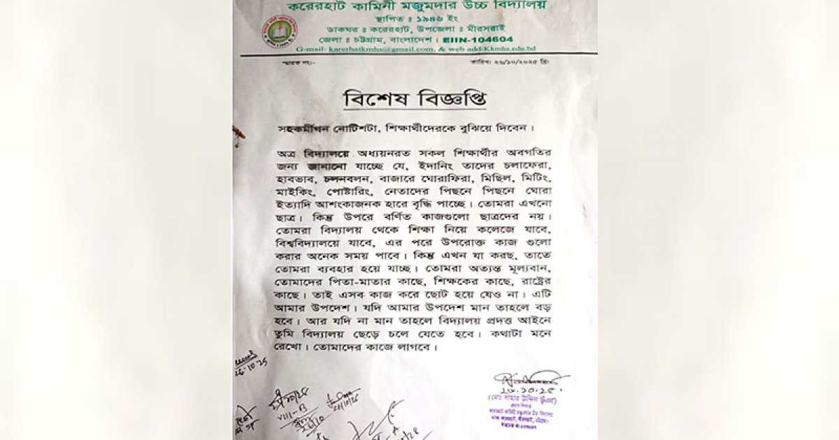 বিদ্যালয়ের প্রধান শিক্ষক বাহার উদ্দিন ভূঁইয়া স্বাক্ষরিত বিজ্ঞপ্তিতে উল্লেখ করা হয়, সম্প্রতি কিছু শিক্ষার্থীর চলাফেরা, হাবভাব, বাজারে ঘোরাফেরা, মিছিল, মিটিং, মাইকিং, পোস্টারিং ও বিভিন্ন নেতার সঙ্গে যুক্ত হওয়ার প্রবণতা আশঙ্কাজনকভাবে বেড়ে গেছে। এসব কর্মকাণ্ড ছাত্রজীবনের পরিপন্থি।