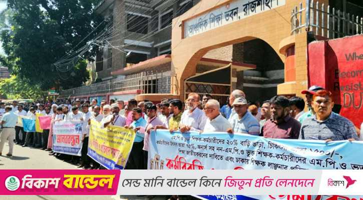 চাকরি জাতীয়করণ, ২০ শতাংশ বাড়িভাড়া, ১৫০০ টাকা চিকিৎসা ভাতা এবং কর্মচারীদের ৭৫ শতাংশ উৎসব ভাতার দাবিতে আন্দোলনরত শিক্ষকদের ওপর ঢাকায় পুলিশের হামলার প্রতিবাদে রাজশাহীতে কর্মবিরতি ও প্রতিবাদ সমাবেশ অনুষ্ঠিত হয়েছে।