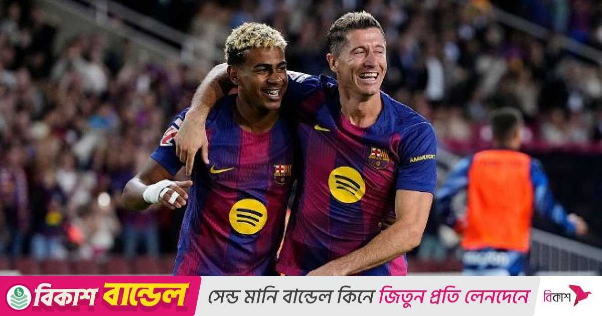 রেমিরো এরপরও দারুণ সেভে লিড ধরে রাখেন, তবে বিরতির ঠিক আগে আর ঠেকাতে পারেননি। কর্নার থেকে জুলস কুন্দের হেডে সমতায় ফেরে বার্সেলোনা। ঘণ্টা না পেরোতেই মাঠে নামেন লামিনে ইয়ামাল। ইউরোপের সেরা তরুণ খেলোয়াড়ের পুরস্কার পাওয়া এই উইঙ্গার নামার কয়েক সেকেন্ডের মধ্যেই ম্যাচ ঘুরিয়ে দেন। তার দারুণ ক্রস থেকে হেডে গোল করেন রবের্ত লেভানডোভস্কি।