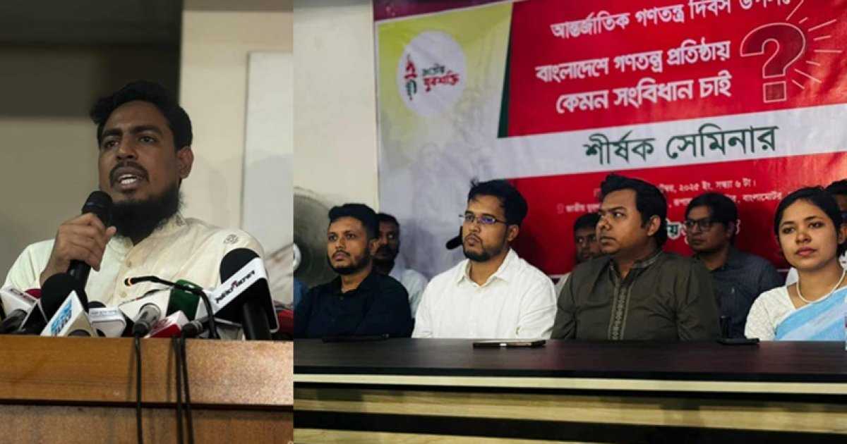 সভাপতির বক্তব্যে জাতীয় যুবশক্তির আহ্বায়ক অ্যাডভোকেট তারিকুল ইসলাম বলেন, ‘আমরা নতুন সংবিধান চাই। কারণ বর্তমান সংবিধান প্রথম পৃষ্ঠায় মুক্তিযুদ্ধ শব্দটি লেখা নেই। এত বছরও তা সংযোজন হয়নি। ২০২৪ সালে দাঁড়িয়ে যে সংবিধানে জনগণের আশা আকাঙ্ক্ষার প্রতিফলন হয়নি, আমরা সে সংবিধান চাই না।’