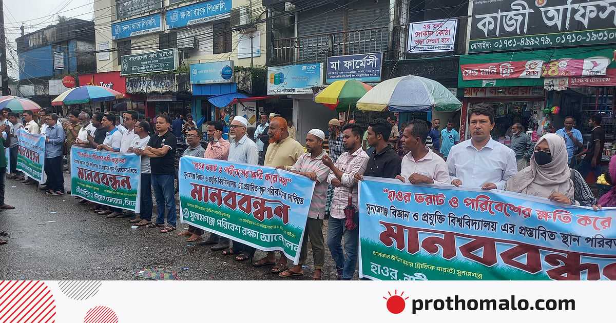 সুনামগঞ্জ বিজ্ঞান ও প্রযুক্তি বিশ্ববিদ্যালয়ের প্রস্তাবিত স্থান পরিবর্তনের দাবিতে মঙ্গলবার পাঁচটি পরিবেশবাদী সংগঠনের উদ্যোগে মানববন্ধন হয়েছে। শহরের আলফাত স্কয়ারে আজ মঙ্গলবার দুপুরে এ কর্মসূচি পালিত হয়।