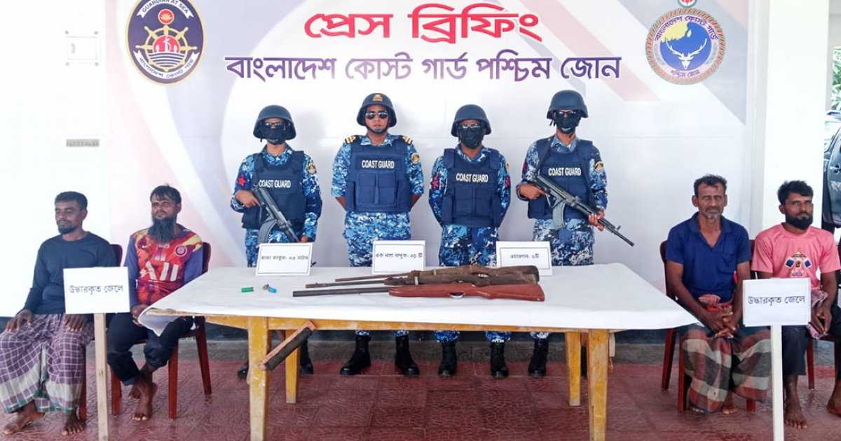 সুন্দরবনের ‘দুর্ধর্ষ ডাকাত জাহাঙ্গীর বাহিনীর’ আস্তানা থেকে অস্ত্র-গোলাবারুদসহ জিম্মি থাকা ৪ জেলেকে উদ্ধার করেছে কোস্টগার্ড। শিবসা নদীসংলগ্ন আড়বাউনি খাল এলাকায় শুক্রবার (৩ অক্টোবর) ভোর ৫টায় অভিযান চালিয়ে এদের উদ্ধার করা হয়। এসব জেলে গত ১০ দিন ধরে জাহাঙ্গীর বাহিনীর কাছে জিম্মি ছিলেন।