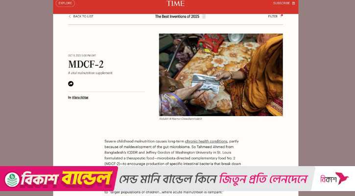 ‘টাইম শ্রেষ্ঠ উদ্ভাবন ২০২৫’-এর সম্মান পেল আইসিডিডিআরবি ও ওয়াশিংটন ইউনিভার্সিটির উদ্ভাবিত অন্ত্র সুস্থকারী খাবার।