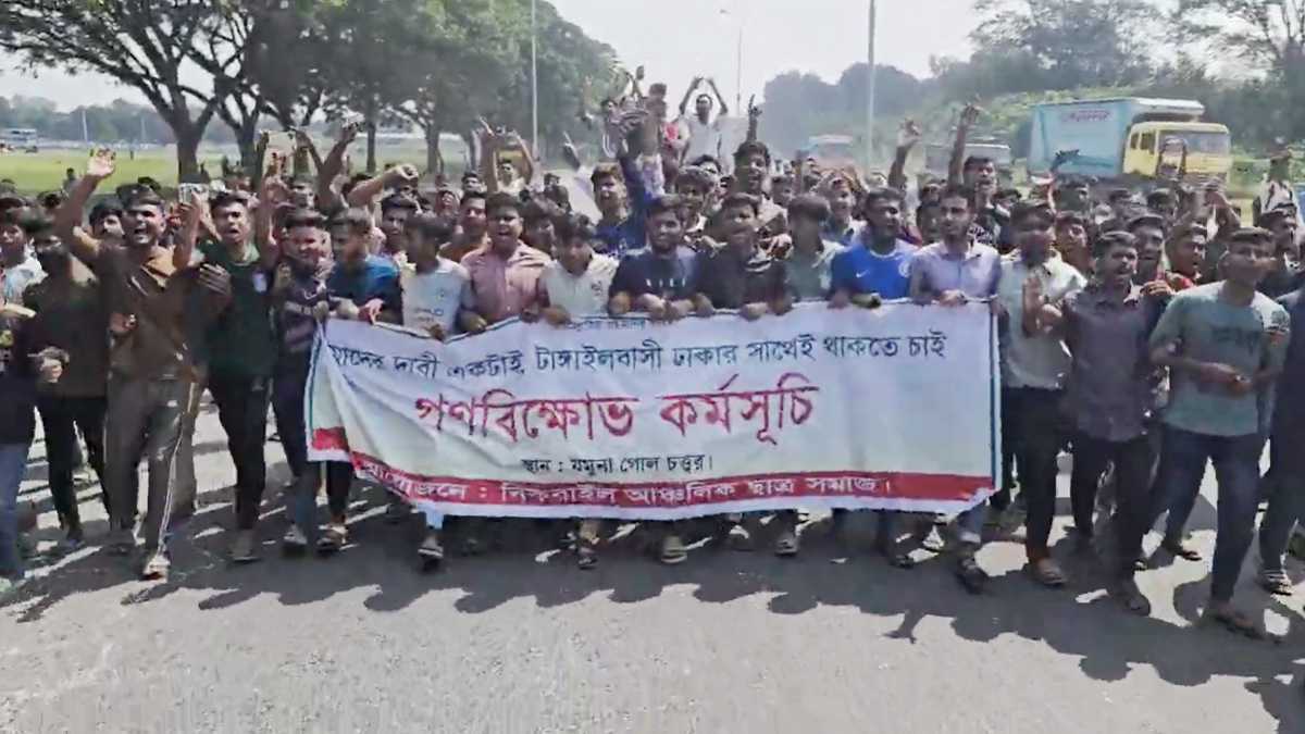 টাঙ্গাইল জেলাকে ঢাকা বিভাগে রাখার দাবিতে টাঙ্গাইলের যমুনা গোলচত্বর এলাকায় যমুনা সেতু মহাসড়ক অবরোধ করে বিক্ষোভ করেছেন এলাকাবাসী।