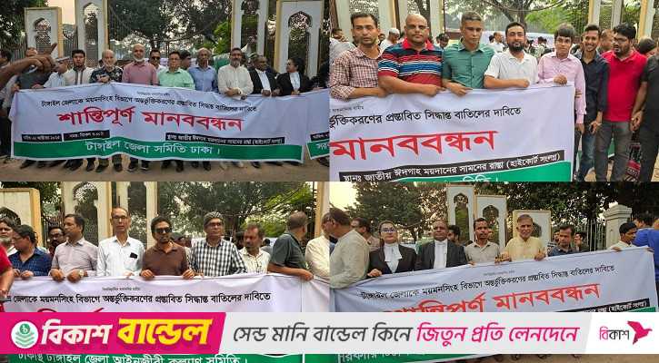 টাঙ্গাইলকে ময়মনসিংহ বিভাগে অন্তর্ভুক্ত করার প্রস্তাবনার প্রতিবাদে মানববন্ধন করেছে ঢাকায় বসবাসরত টাঙ্গাইলের শিক্ষার্থী ও সাধারণ মানুষ। বুধবার (২২ অক্টোবর) বিকেলে রাজধানীর হাইকোর্টের সামনে এ মানববন্ধন অনুষ্ঠিত হয়।