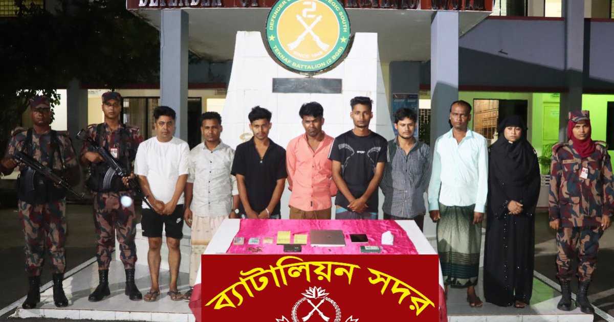 আটক ব্যক্তিরা হলো– টেকনাফের তুলতুলি এলাকার মৃত হোসেন আহমেদের ছেলে আব্দুর রশিদ (৩৫), একই এলাকার মৃত জগির আহমদের ছেলে জাহেদ (১৮), লেঙ্গুর বিলের নুর বশরের ছেলে মিজানুর রহমান (২০), উখিয়ার থাইংখালী ১৯ নম্বর রোহিঙ্গা ক্যাম্পের আইয়ুবের ছেলে আবু তৈয়ব (২৫), মিয়ানমারের বুচিডং এর নুর মোহাম্মদের ছেলে ইদ্রিস (৩৫), দক্ষিণ জালিয়াপাড়ার মৃত রশিদ উল্লাহর ছেলে জুবায়ের (৩৩), কচ্ছপিয়া এলাকার নুর মোহাম্মদের ছেলে নুরুল আবসার (১৮), ছোট হাবির পাড়ার মৃত সোহরাবের ছেলে ইসমাইল (৩২), বড় ডেইল এলাকার মোহাম্মদ হোসেনের ছেলে ইমরান (২৮), কচ্ছপিয়া এলাকার নুর ইসলামের ছেলে নুর মোহাম্মদ (৪০), ২৭ নম্বর রোহিঙ্গা ক্যাম্পের জহিরের ছেলে মাহমুদ উল্লাহ (৩০), কচ্ছপিয়ার নুর মোহাম্মদের স্ত্রী খুরশিদা বেগম (৩৪)।