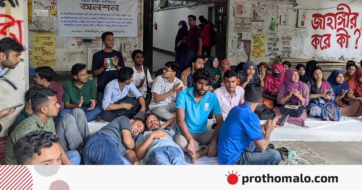 আজ বুধবার দুপুরে এ প্রতিবেদন লেখা পর্যন্ত বিশ্ববিদ্যালয়ের ভাষাশহীদ রফিক ভবনের নিচে তিন দফা দাবিতে অনশন চালিয়ে যেতে দেখা যায় শিক্ষার্থীদের। এ সময় বিশ্ববিদ্যালয়ের বিভিন্ন ছাত্র সংগঠনসহ সাধারণ শিক্ষার্থীদের অনশনের সঙ্গে সংহতি প্রকাশ করে তাঁদের খোঁজখবর নিতে দেখা যায়।