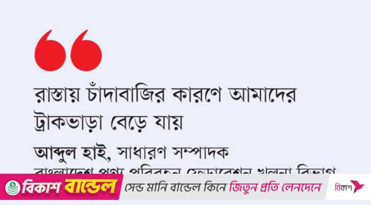 বাংলাদেশ পণ্য পরিবহন ফেডারেশনের খুলনা বিভাগীয় কমিটির সাধারণ সম্পাদক আব্দুল হাই বলেন, ‘বর্তমানে মেহেরপুর থেকে কারওয়ান বাজারে তিন টনের একটি ট্রাকে পণ্য পাঠাতে খচর পড়ে ১৬ থেকে ১৭ হাজার টাকা। এই আকারের একটি ট্রাক থেকে ন্যূনতম তিন হাজার টাকা করে চাঁদাবাজি করা হয়। রাস্তায় চাঁদাবাজির কারণে আমাদের ট্রাকভাড়া বেড়ে যায়। চালক রাস্তায় যে টাকা চাঁদা হিসেবে দেন, তা হিসাব করে ট্রাক মালিককে ওই টাকা পরিশোধ করতে হয়। এ কারণে একজন ব্যবসায়ী তাঁর পণ্য গন্তব্যে পৌঁছে দিতে চাইলে ট্রাক মালিক রাস্তার বাড়তি খরচ হিসাব করে ভাড়া নির্ধারণ করেন। ’