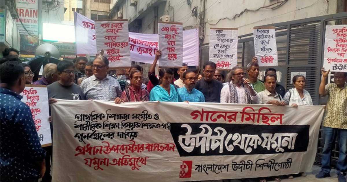 সরকারি প্রাথমিক বিদ্যালয়ে সংগীত ও শারীরিক শিক্ষা বিষয়ক শিক্ষক পদ পুনর্বহালের দাবিতে উদীচীর গানের মিছিল পুলিশি বাধার মুখে পড়েছে। পরে প্রাথমিক শিক্ষায় সংগীত ও শারীরিক শিক্ষা বিষয়ক শিক্ষক নিয়োগ বাতিলের সিদ্ধান্ত থেকে সরে আসতে সরকারকে সাত দিনের আল্টিমেটাম দেন তারা। সোমবার (১০ নভেম্বর) উদীচীর এক সংবাদ বিজ্ঞপ্তিতে এ তথ্য জানানো হয়।