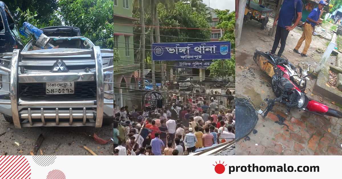 ফরিদপুরে সংসদীয় আসন পুনর্বিন্যাসের প্রতিবাদে ও পুরোনো সীমানা বহালের দাবিতে আয়োজিত মহাসড়ক ও রেলপথ অবরোধ কর্মসূচি আজ সোমবার দুপুরে সহিংস রূপ নিয়েছে। বিক্ষুব্ধ জনতা ভাঙ্গা থানা ও উপজেলা পরিষদ প্রাঙ্গণে হামলা চালিয়ে ভাঙচুর করেছেন। উপজেলা অফিসার্স ক্লাবে অগ্নিসংযোগও করা হয়। এ সময় সাংবাদিকদের ওপরও চড়াও হন বিক্ষোভকারীরা। তাঁদের মুঠোফোন কেড়ে নেওয়া হয় এবং শারীরিকভাবে লাঞ্ছিত করার চেষ্টা করা হয়।