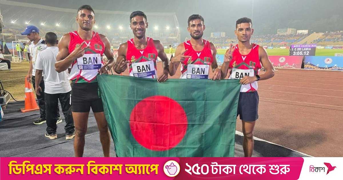 ৪ গুণিতক ৪০০ মিটারে পুরুষ বিভাগে দৌড়েছেন মাসুদ রানা, তারেক, নাজিমুল হোসেন রনি ও লুসাদ ইসলাম। তারা ৩ মিনিট ১৫ সেকেন্ড সময় নেন। এই ইভেন্টে প্রথম হওয়া লঙ্কান স্প্রিন্টারদের টাইমিং ৩ মিনিট ৫.১২ সেকেন্ড।