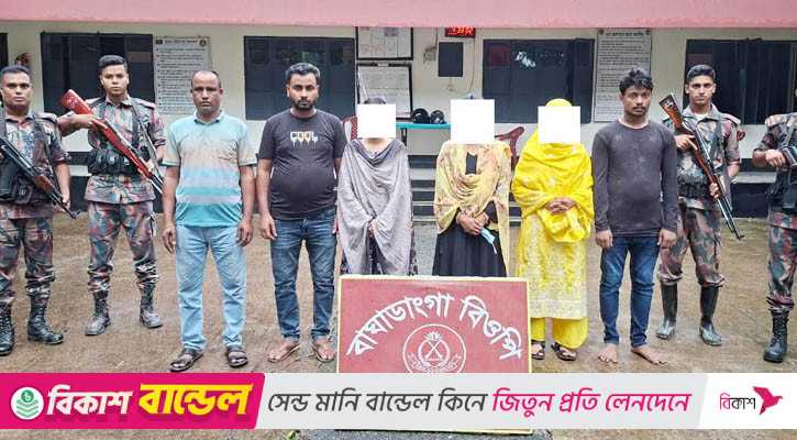 বিজিবি জানায়, শনিবার দুপুর সাড়ে ১২টার দিকে বাঘাডাংগা বিওপির হাবিলদার সাইফুর রহমানের নেতৃত্বে সীমান্ত পিলার ৬০/৩৭-আর এলাকায় অভিযান চালানো হয়। এ সময় তিন নারী ও এক শিশুসহ পাঁচজনকে আটক করা হয়।