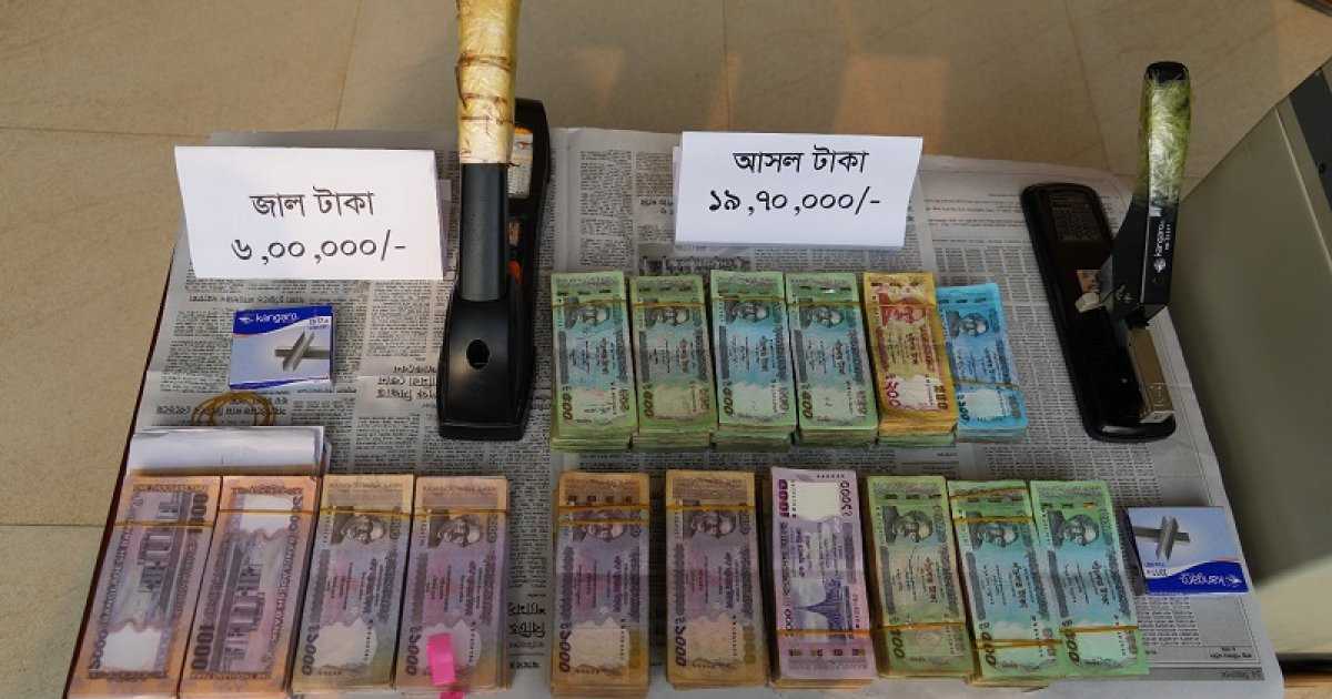 গ্রেফতার ব্যক্তিরা হলেন— নূরুল হক (৩২) ও সাইদুল আমিন (২৪)। এ সময় তাদের কাছ থেকে ৬ লাখ টাকার জাল নোট, ১৯ লাখ ৭০ হাজার টাকার আসল নোট, একটি টাকা গণনার মেশিন, দুইটি স্ট্যাপলিং মেশিন এবং দুই প্যাকেট স্ট্যাপলার পিন জব্দ করা হয়।