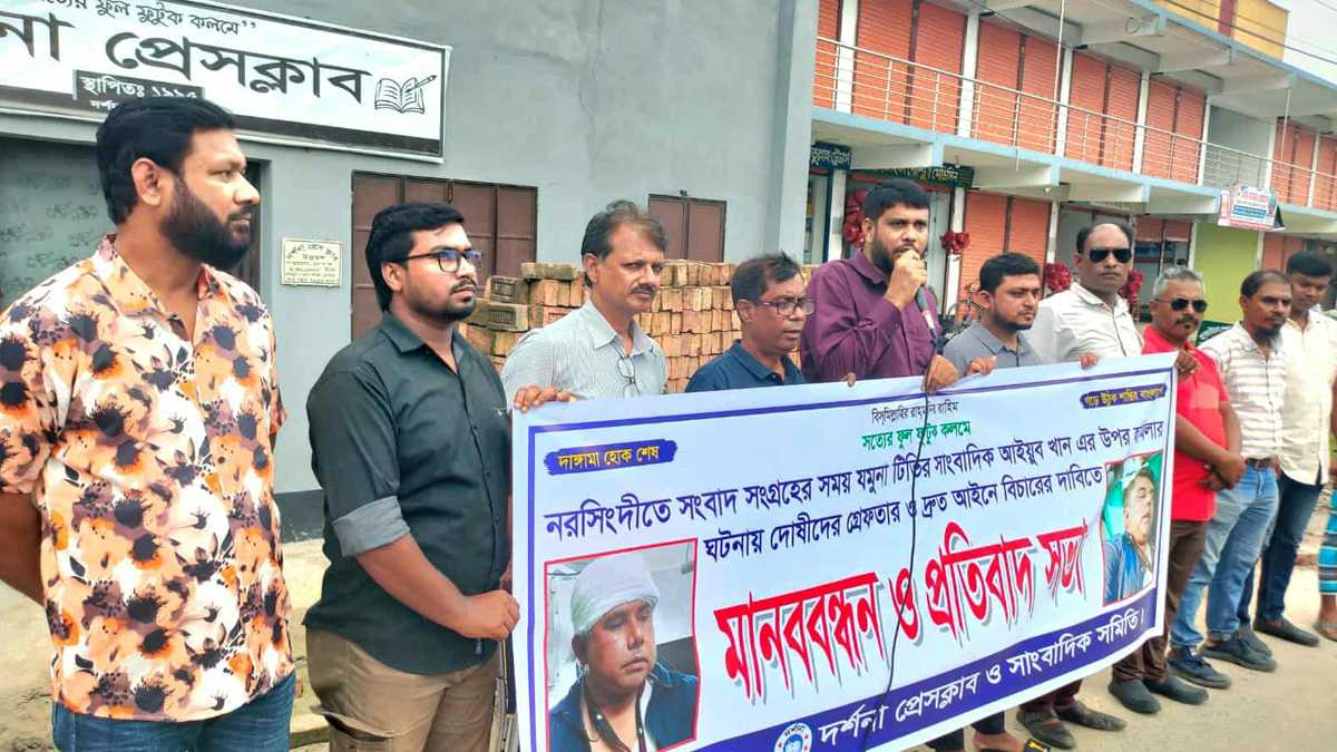 নরসিংদীতে সংবাদ সংগ্রহের সময় যমুনা টিভির সাংবাদিক আইয়ুব খানের ওপর সন্ত্রাসী হামলার ঘটনায় দোষীদের গ্রেফতার ও দ্রুত আইনে বিচারের দাবিতে চুয়াডাঙ্গার দর্শনায় মানববন্ধন ও প্রতিবাদ সভা অনুষ্ঠিত হয়েছে।