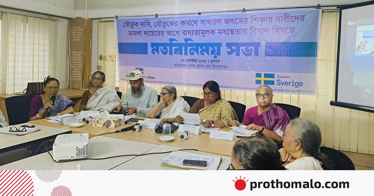 আজ বুধবার রাজধানীর সেগুনবাগিচায় বাংলাদেশ মহিলা পরিষদ এ সভার আয়োজন করে। ‘যৌতুক দাবি, যৌতুকের কারণে সাধারণ জখমের শিকার নারীদের মামলার আগে বাধ্যতামূলক মধ্যস্থতার বিধান’ শিরোনামে মতবিনিময় সভাটি অনুষ্ঠিত হয় বাংলাদেশ মহিলা পরিষদের কার্যালয়ের সুফিয়া কামাল ভবনের আনোয়ারা বেগম-মুনিরা খান মিলনায়তনে।